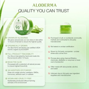 Details: Add pure Aloe Vera to your skincare routine and allow its natural properties to moisturize, nourish, soothe, and improve overall skin elasticity. We never use aloe powder or concentrates. Our Pure Aloe Vera Gel contains 96% fresh organic Aloe juice. Just apply evenly and massage into the skin morning and night or use as a hydrating mask at night. Perfect for everyday use on all skin types, our Pure Aloe Vera Gel is a natural soothing and moisturizing treatment for your daily skin care regimen. At Aloderma, we capture the true essence and peak bioactivity of centuries old Aloe Vera. By hand harvesting on our organically fertilized and Ecocert certified plantations, we are able to give you quality products while respecting the environment. Through proprietary SATT technology, we can process and bottle our products within hours of harvesting on our Aloe Vera plantations. With fresh Aloe Vera, respect for nature, and proprietary technology, Aloderma delivers high quality products for your skin.
