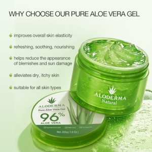 - Pure Aloe Vera Gel: Aloderma Pure Aloe Gel is a fast-acting moisturizer that helps restore skin’s natural balance and hydration. It provides intense hydration for a plump and supple complexion. It’s lightweight and fast-absorbing and it’s suitable for all skin types.