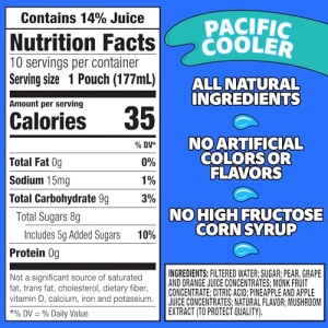 Details: Grab a little juicy freedom with Capri Sun Pacific Cooler Mixed Fruit Flavored Juice Drink Blend. Made with the all-natural sweetener, monk fruit, our Pacific Cooler drink has a fruity flavor of apples and grapes that’s joyfully refreshing. Kids love the taste of Capri Sun, now with half the sugar vs leading regular juice drinks. We never add artificial flavors, colors, preservatives or high-fructose corn syrup to our pouches. Each 6 fluid ounce pouch in our 10 count box comes with a straw, so they’re ready for kids to squeeze and sip. Unleash kids’ independence with a ready-to-drink Capri Sun.