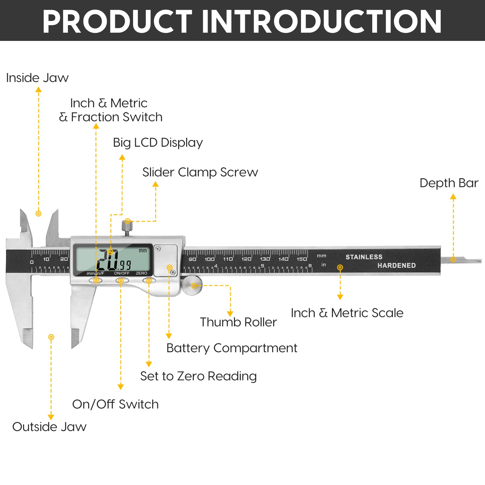 • 【ACCURATE MEASUREMENT AND ZERO SETTING】This digital caliper slides smoothly. Measuring range: 0 -6″ / 0-150mm; Accuracy: ± 0.001″/ 0.02mm; Resolution: 0. 0005″/0. 01mm. Smart design allows you to easily reset to zero by pressing a button and start a new measurement at any point on the scale, which is very suitable for differential measurement.