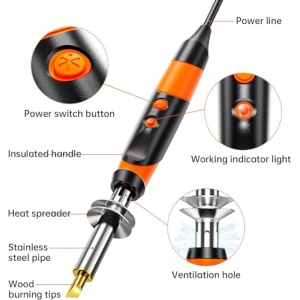 - 【woodburner tool】The wood burner has an on/off key, can energy saving and safe soldering,It is a 110V 30W wood burning tool,warming up faster,can be heated within 90 seconds,lightweight, ergonomic handle of the soldering iron allows you to operate at different angles without fatigue. The high-temperature protective case protects you from working on the pyrography project for hours without sweating.